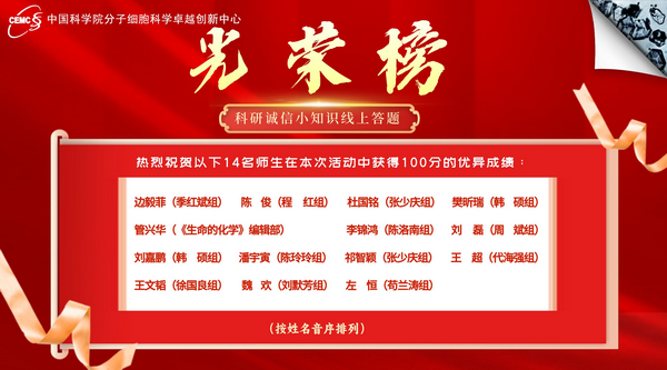 熱烈祝賀以下14名師生在本次活動中獲得100分的優(yōu)異成績(按姓名音序排列):邊毅菲(季紅斌組)、陳俊(程紅組)、杜國銘(張少慶組)、樊昕瑞(韓碩組)、管興華(《生命的化學》編輯部)、李錦鴻(陳洛南組)、劉磊(周斌組)、劉嘉鵬(韓碩組)、潘宇寅(陳玲玲組)、祁智穎(張少慶組)、王超(代海強組)、王文韜(徐國良組)、魏歡(劉默芳組)、左恒(茍?zhí)m濤組)。