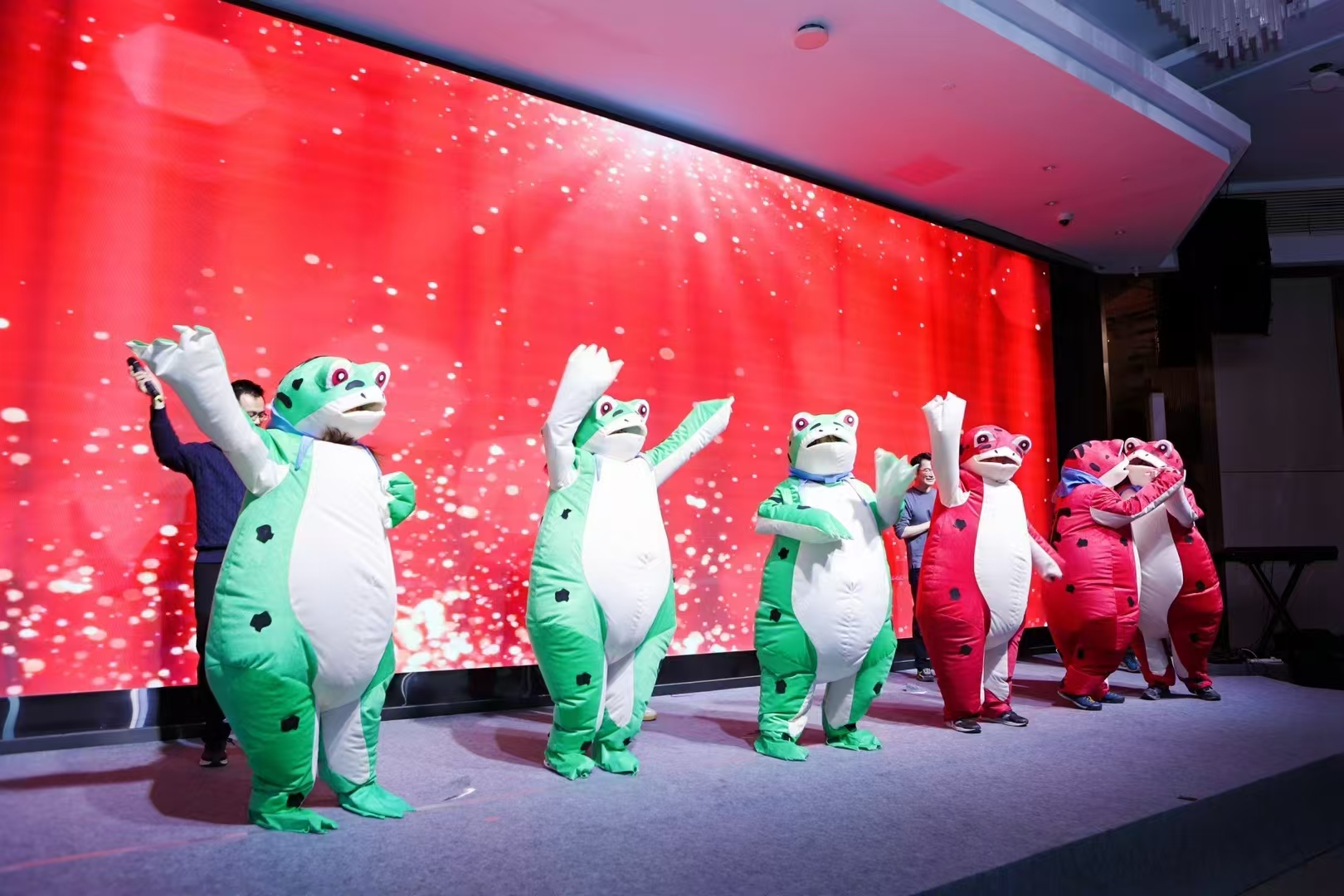 “閃亮的日子” 篇章洋溢著溫馨與歡樂?;@球操《本草綱目辣不辣》動感十足,表演者們活力迸發(fā),點(diǎn)燃了現(xiàn)場的熱烈氣氛。退休職工代表帶來的小組唱《閃亮的日子》,歌聲悠揚(yáng)婉轉(zhuǎn),仿佛帶領(lǐng)大家回溯那些美好的舊時光。中心四位PI組成的 “老男孩組合” 驚喜現(xiàn)身,他們共同演唱《光輝歲月》《直到世界盡頭》。熟悉的旋律響起,激昂的歌聲中飽含著對往昔奮斗歲月的深情回顧,以及對未來的堅(jiān)定信念,引發(fā)了全場的強(qiáng)烈共鳴,將現(xiàn)場氣氛推向高潮。抽獎環(huán)節(jié)穿插其中,驚喜連連,歡聲笑語回蕩在整個大廳,盡顯中心大家庭的溫暖與融洽。