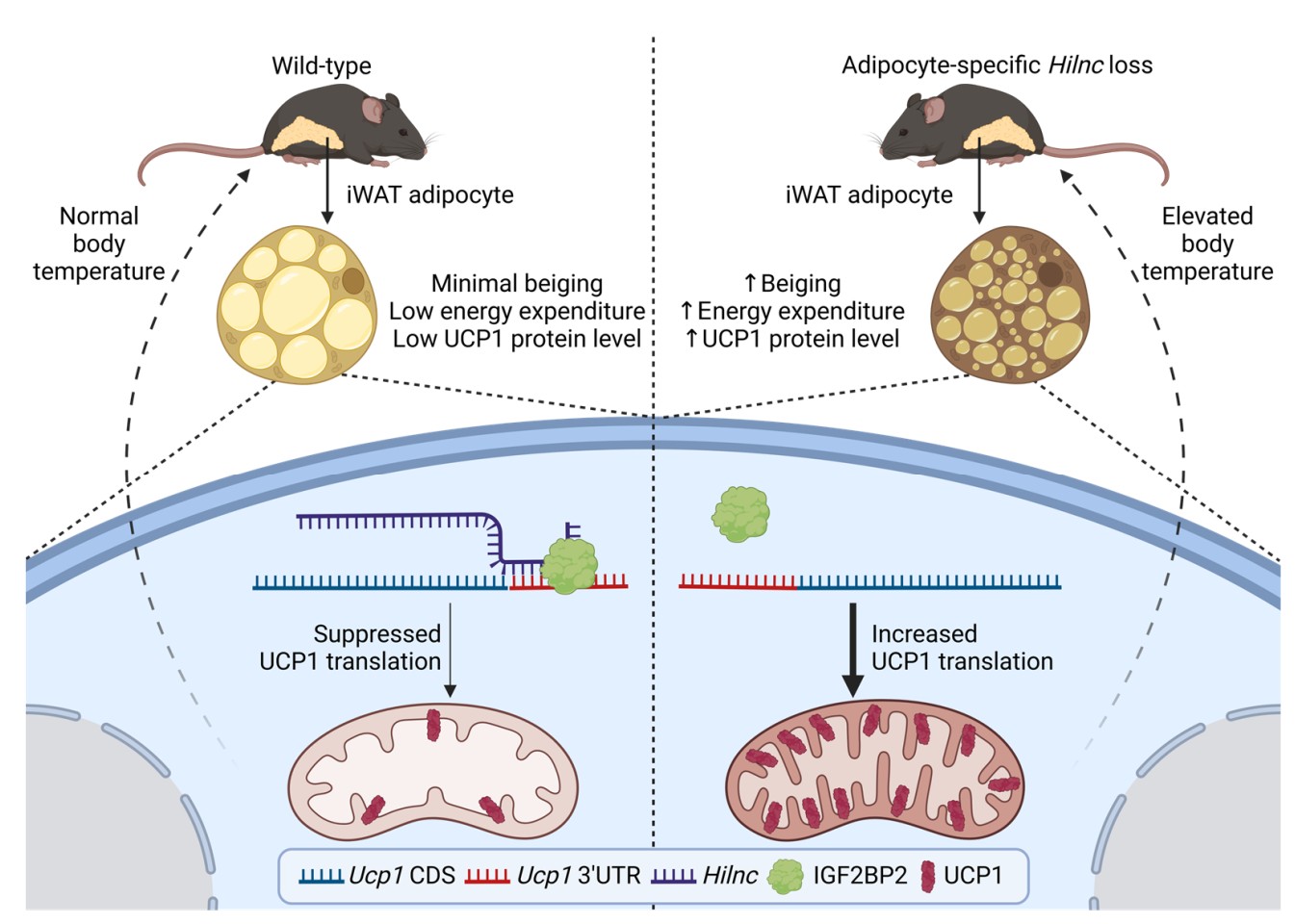 米色脂肪細(xì)胞在低溫等刺激下能通過上調(diào)表達(dá)解偶聯(lián)蛋白1(UCP1)進(jìn)行產(chǎn)熱,在體溫調(diào)節(jié)和能量平衡中扮演關(guān)鍵角色。盡管UCP1的轉(zhuǎn)錄調(diào)控已被廣泛研究,但其轉(zhuǎn)錄后調(diào)控機(jī)制,尤其是翻譯水平的調(diào)控,尚不清晰。長(zhǎng)鏈非編碼RNA(lncRNA)作為一類重要的調(diào)控分子,在代謝過程中發(fā)揮多重作用,但其是否以及如何參與UCP1的翻譯調(diào)控仍是未知領(lǐng)域。