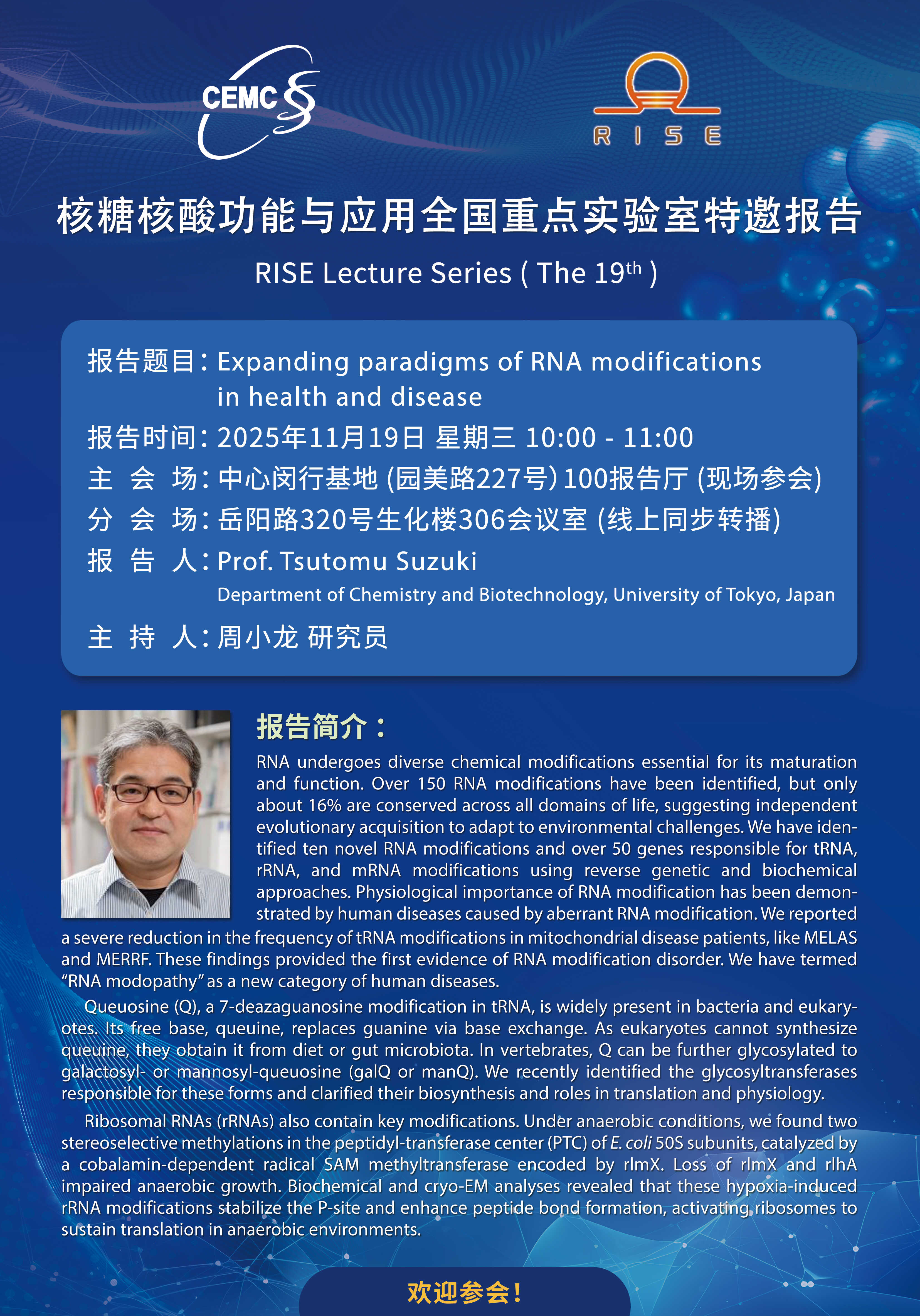 Prof.Tsutomu Suzuki,?University of Tokyo:?Expanding paradigms of RNA modifications?in health and disease