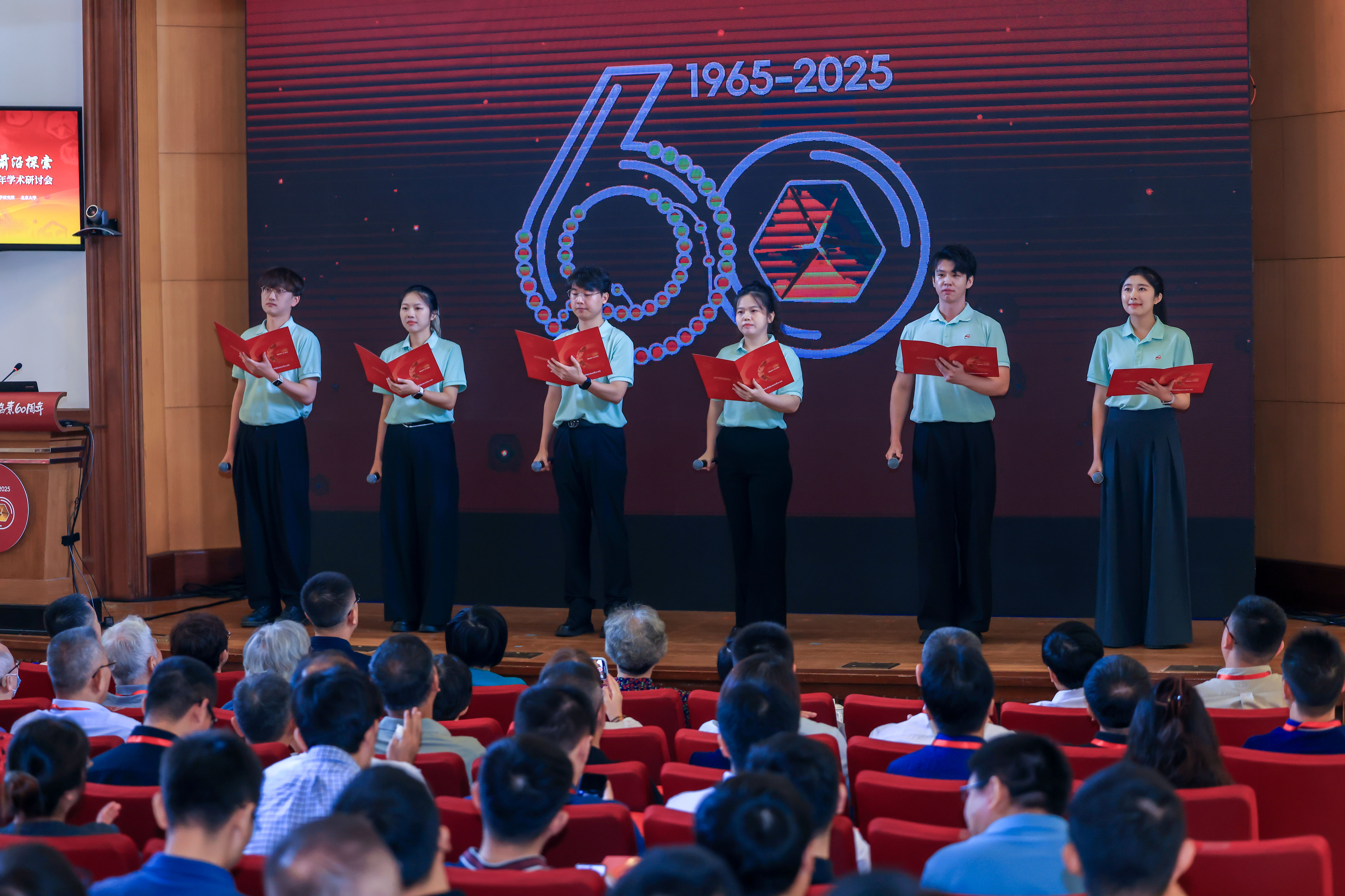 一甲子前的科學(xué)豐碑,照亮今天的科技攻堅(jiān)路。大會(huì)現(xiàn)場(chǎng),來自分子細(xì)胞卓越中心青年理論小組、團(tuán)委、研究生會(huì)的青年科技工作者代表宋嘉文、高佳琪、梅自律、李榮耀、王尚宇、孔德慧以飽含深情的朗誦,將現(xiàn)場(chǎng)觀眾帶回了六十年前那段艱苦卓絕的歲月。一張張老照片將老一輩科學(xué)家的奮斗瞬間定格,一場(chǎng)跨越甲子的時(shí)空對(duì)話就此展開。在悠揚(yáng)的配樂中,他們用青春之聲詮釋了“獻(xiàn)身、求實(shí)、團(tuán)結(jié)、奮進(jìn)”的胰島素精神,展現(xiàn)了青年一代承接榮光、續(xù)寫傳奇的堅(jiān)定信念。