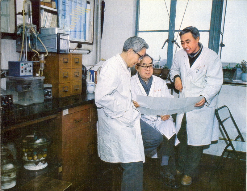 中國科學院生物化學研究所龔岳亭(左)、鈕經義(中)、杜雨蒼(右)討論多肽合成新方案