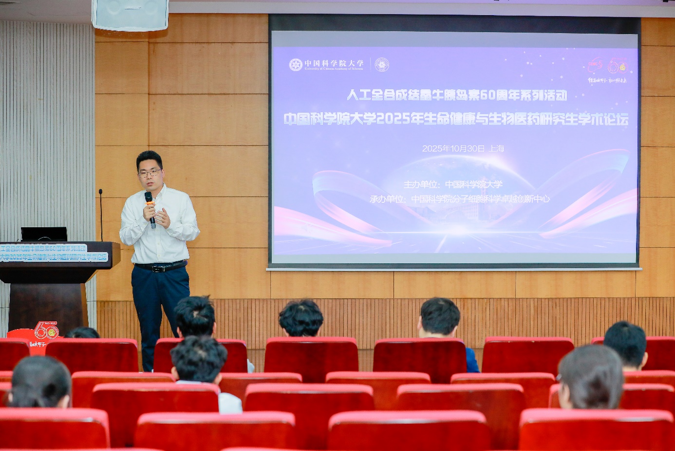 為進(jìn)一步弘揚(yáng)科學(xué)精神,強(qiáng)化研究生學(xué)風(fēng)建設(shè),營(yíng)造濃厚的學(xué)術(shù)研究氛圍,為學(xué)生搭建跨地域、跨單位、跨學(xué)科的學(xué)術(shù)交流平臺(tái),10月30日,值此人工全合成結(jié)晶牛胰島素成果完成60周年之際,由中國(guó)科學(xué)院大學(xué)主辦,分子細(xì)胞卓越中心承辦的“人工全合成結(jié)晶牛胰島素60周年系列活動(dòng)——中國(guó)科學(xué)院大學(xué)2025年生命健康與生物醫(yī)藥研究生學(xué)術(shù)論壇”順利舉辦。中心學(xué)位委員會(huì)副主席陳勇研究員、相關(guān)領(lǐng)域?qū)<覍W(xué)者、導(dǎo)師代表及來(lái)自國(guó)科大相關(guān)培養(yǎng)單位的200余名研究生參加論壇。論壇特邀復(fù)旦大學(xué)生物醫(yī)學(xué)研究院陳飛研究員、中國(guó)科學(xué)院上海營(yíng)養(yǎng)與健康研究所陳大明研究館員作專題報(bào)告,中心博士研究生楊佳穎和張宇航共同主持本次活動(dòng)。
