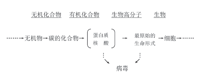 可以設(shè)想,在其他星球上如果有生命,其最基本的物質(zhì)系統(tǒng),如不是蛋白質(zhì)與核酸,也必會是按類似的結(jié)構(gòu)原則組成的“信息”高度集中的化合物。病毒的出現(xiàn)可以看做是演化途中的一條歧路,也可看成生命物質(zhì)由于核酸“犯錯誤”而退化所成。無論怎樣了解,所有的病毒,其主要組成都是蛋白質(zhì)與核酸,最簡單的病毒只有一種蛋白質(zhì)外殼和一種核酸內(nèi)含物。病毒雖然能夠增殖,但自己不能進(jìn)行新陳代謝,要依靠寄主的新陳代謝體系才能生存。