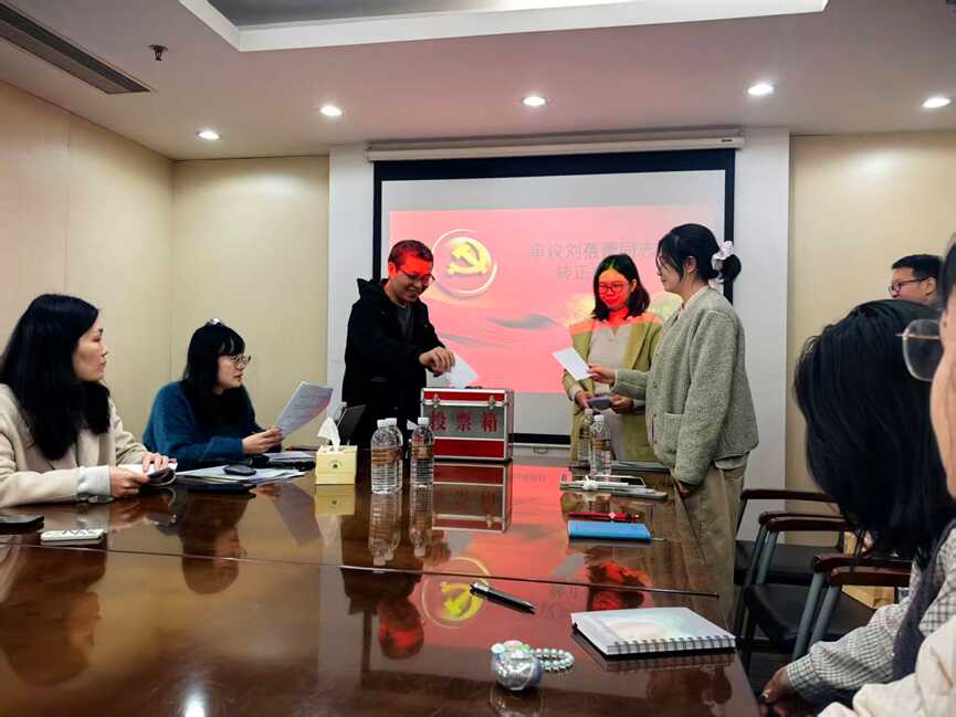 隨后,會議審議劉蓓蕾同志預備黨員轉正申請。會上,劉蓓蕾同志匯報了預備期間的思想、工作、學習情況,深刻剖析自身不足與改進方向;入黨介紹人林曉靜同志和蘇秋鈺同志分別對其預備期表現(xiàn)進行客觀評價,肯定其成長進步并提出期望。與會黨員充分討論后,14 名有投票權的黨員以無記名投票方式進行表決,最終全票通過劉蓓蕾同志的轉正申請,同意其按期轉為正式黨員。