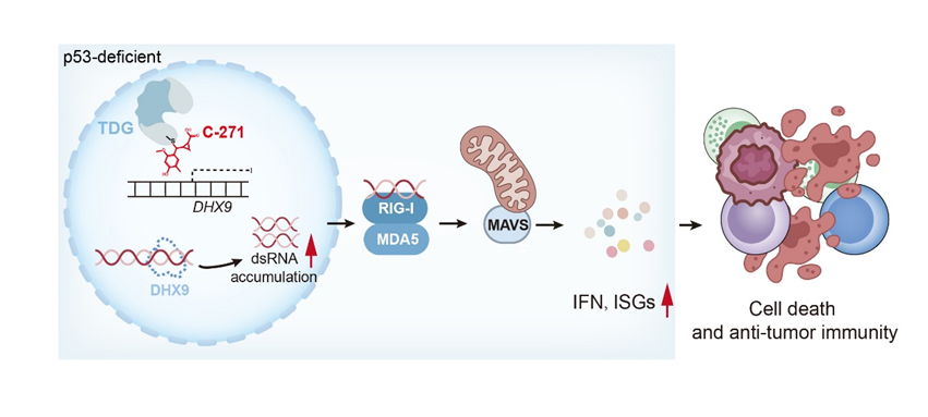 P53的點突變和缺失在多種腫瘤中廣泛存在,且在所有腫瘤類型中占比過半,部分癌種如小細胞肺癌、卵巢癌等甚至高達70-90%。作為經(jīng)典的腫瘤抑制基因,P53難以通過靶向開發(fā)小分子抑制劑進行治療,因此攜帶P53突變的腫瘤患者亟需創(chuàng)新藥物和療法以應對臨床治療挑戰(zhàn)。本研究中,研究人員發(fā)現(xiàn)TDG是p53缺失腫瘤中的一個新型合成致死靶點。敲除TDG可抑制p53缺失腫瘤細胞的增殖,而對于p53野生型的腫瘤細胞則沒有任何影響。該現(xiàn)象在KrasG12D驅動的小鼠肺腺癌模型以及多種人腫瘤細胞系中均得到了驗證。機制上,研究人員發(fā)現(xiàn)TDG和p53在轉錄調(diào)控方面功能互補,兩者均作用于RNA解旋酶DHX9的啟動子區(qū)域并促進其轉錄,維持DHX9的穩(wěn)定表達。在p53缺失的腫瘤細胞中,TDG加強了對DHX9的轉錄激活,彌補了p53的缺失,而抑制TDG則導致DHX9表達下調(diào),從而引發(fā)異常的dsRNA積累,激活RIG-I/MDA5–MAVS信號通路,最終實現(xiàn)腫瘤抑制并增強抗腫瘤免疫。
